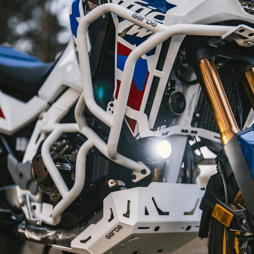 Gmole można uzupełnić o regulowany uchwyt na światła marki GARDA, który pozwala na wsunięcie halogenów w obręb gmoli podczas jazdy dziennej, aby nie były one uszkodzone w przypadku upadku.
