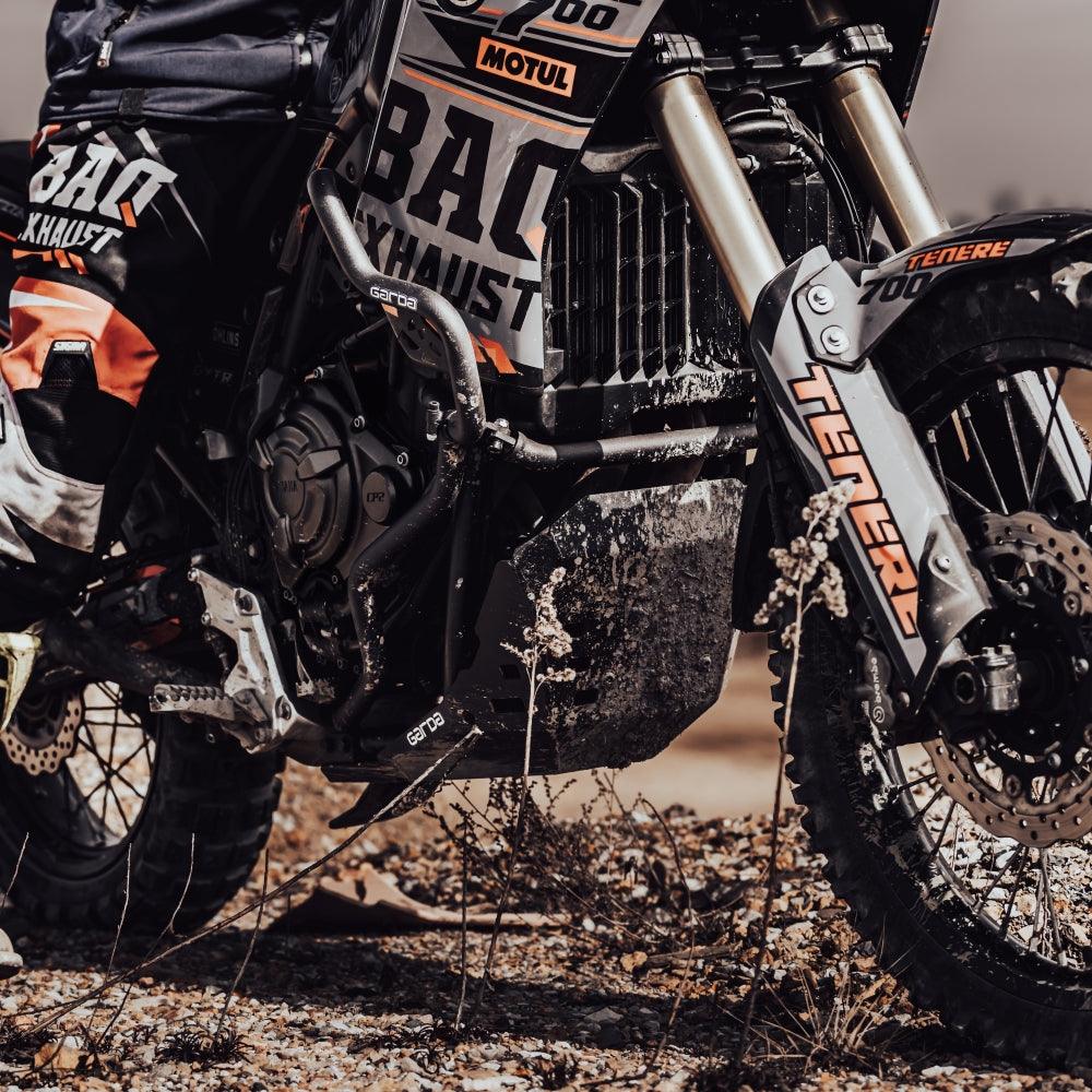 Gmole Yamaha Tenere 700 w wersji PRO – euro 4, euro 5. Zostały zaprojektowane, aby chronić motocykl w najtrudniejszych warunkach. Główna część wykonana jest z rury 25x2mm, która została zaprojektowana tak, aby wytrzymywać duże obciążenia. Podstawą gmoli są 3 punkty podparcia na każdą stronę, co zapewnia maksymalne wsparcie konstrukcji i optymalne rozłożenie sił na wszystkie punkty. Całość została zespawana metodą TIG. Staraliśmy się, aby cała konstrukcja była jak najbardziej kompaktowa, aby zmniejszyć opór powietrza podczas jazdy oraz zmniejszyć wagę konstrukcji.
