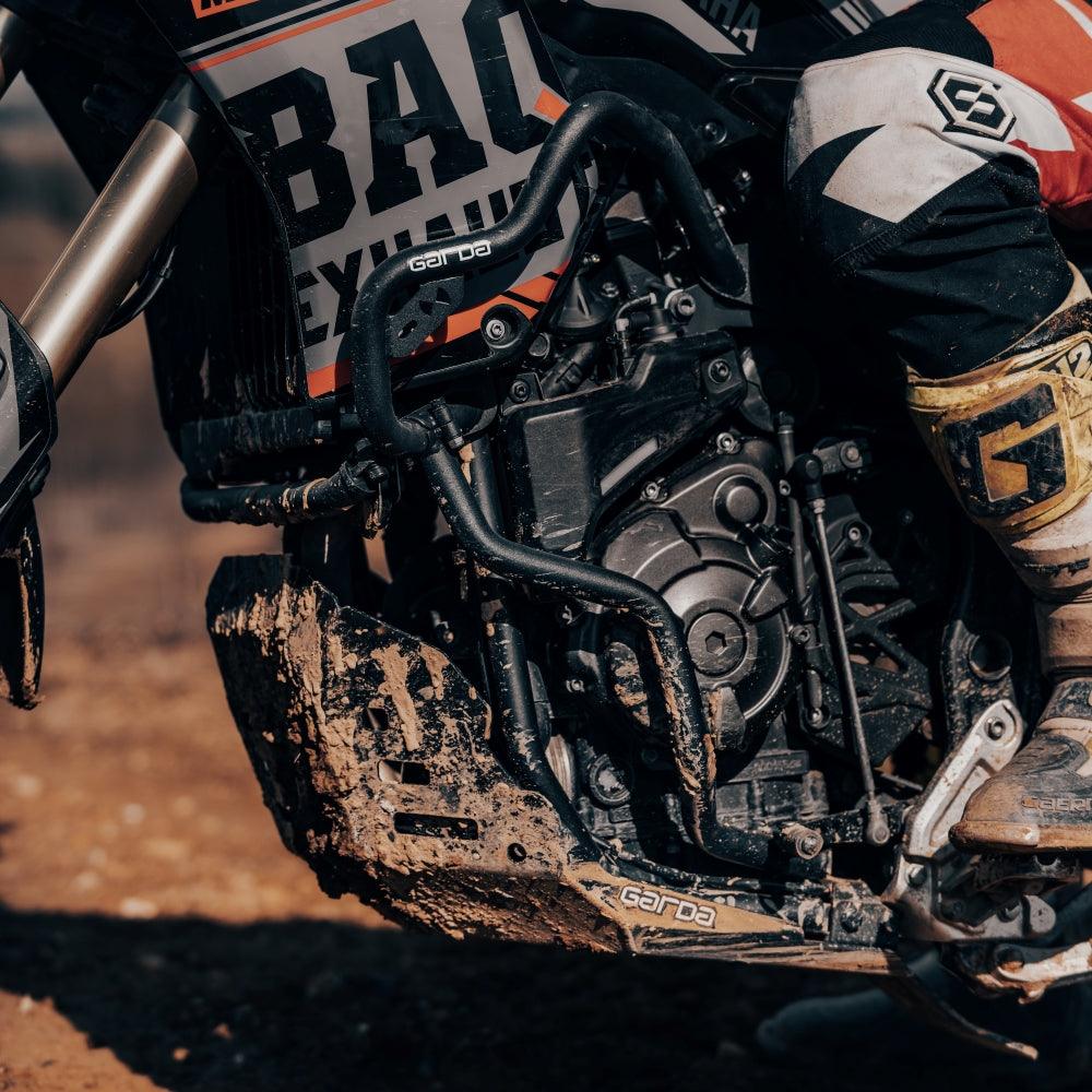 Osłona silnika Yamaha Tenere 700 od GARDA zapewnia ochronę najważniejszych części motocykla oraz dodatkowo chroni ramę i elementy wydechu przed kamieniami wystrzeliwującymi się spod przedniego koła. Blachę spawamy po obu stronach, aby mieć pewność, że spełni swoje zadanie nawet w najtrudniejszych warunkach. Dodatkowo wszystkie części są piaskowane, a następnie pokrywane proszkowo, co zapewnia długą żywotność produktu. Do aluminiowej osłony dodano ochronnik stabilizatora o grubości 6 mm wykonany z wysokoelastycznego polietylenu (HDPE), który chroni wystający element zawieszenia, nie zakłócając jednak jego pracy dzięki swojej elastyczności.