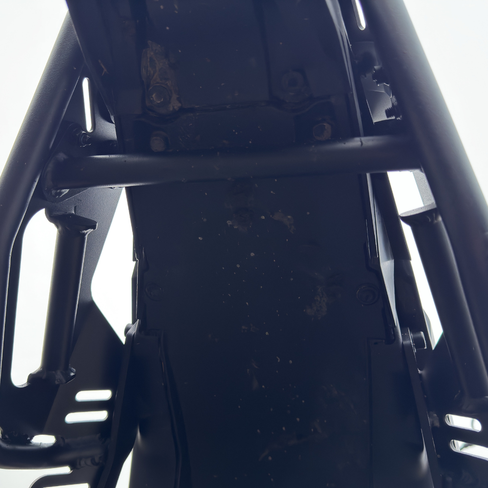 Rama stelaża wykonana jest z rury stalowej o średnicy 18–22 mm, co gwarantuje lekkość i wysoką odporność na odkształcenia. Konstrukcja została opracowana tak, aby nie ingerować w elementy silnika czy chłodnicy oraz nie utrudniać montażu gmoli czy osłony silnika.
